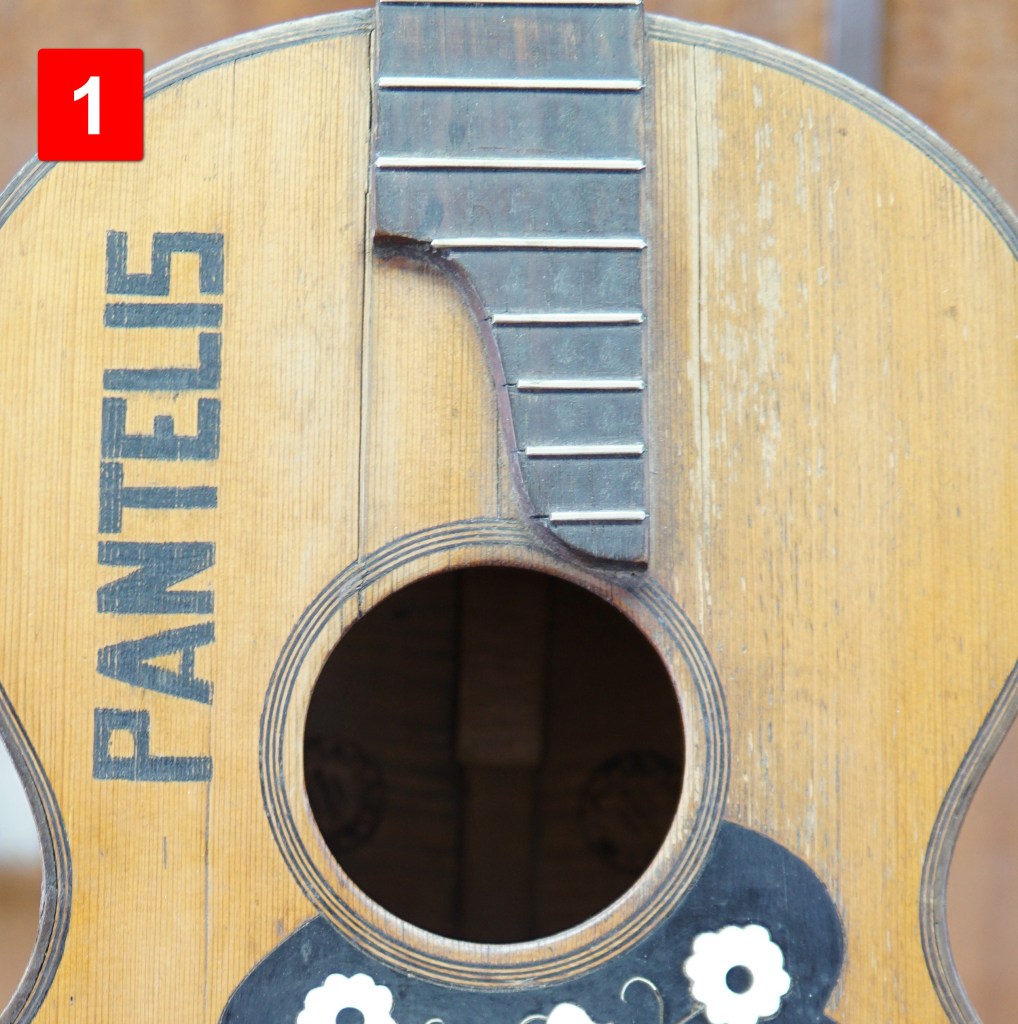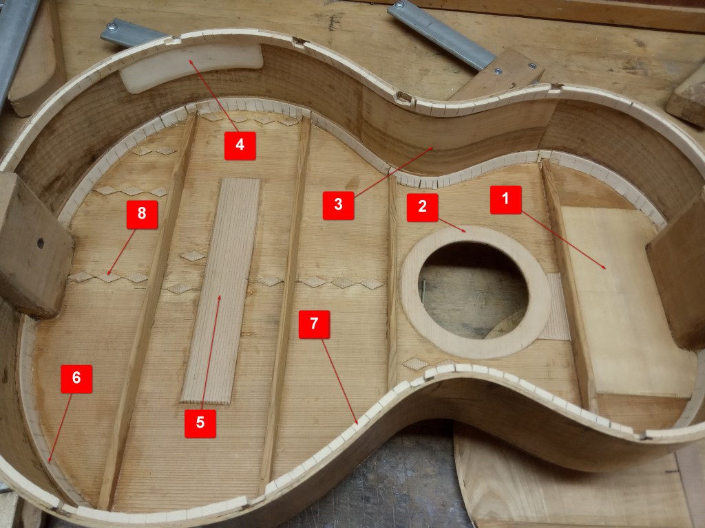 - Ενίσχυση στο καπάκι, στην περιοχή κάτω από την ταστιέρα. Είναι από τις περιοχές που δέχονται τις μεγαλύτερες πιέσεις από το τράβηγμα των χορδών καθώς εκεί κοντράρει το μανίκι μέσω του τάκου και της ταστιέρας, πάνω στο καπάκι, και είναι ο λόγος που έχουμε τόσες πολλές ρωγμές και παραμορφώσεις σε εκείνο το μέρος συχνά στις κιθάρες, αλλά και σε άλλα όργανα. (Φωτ. 1)