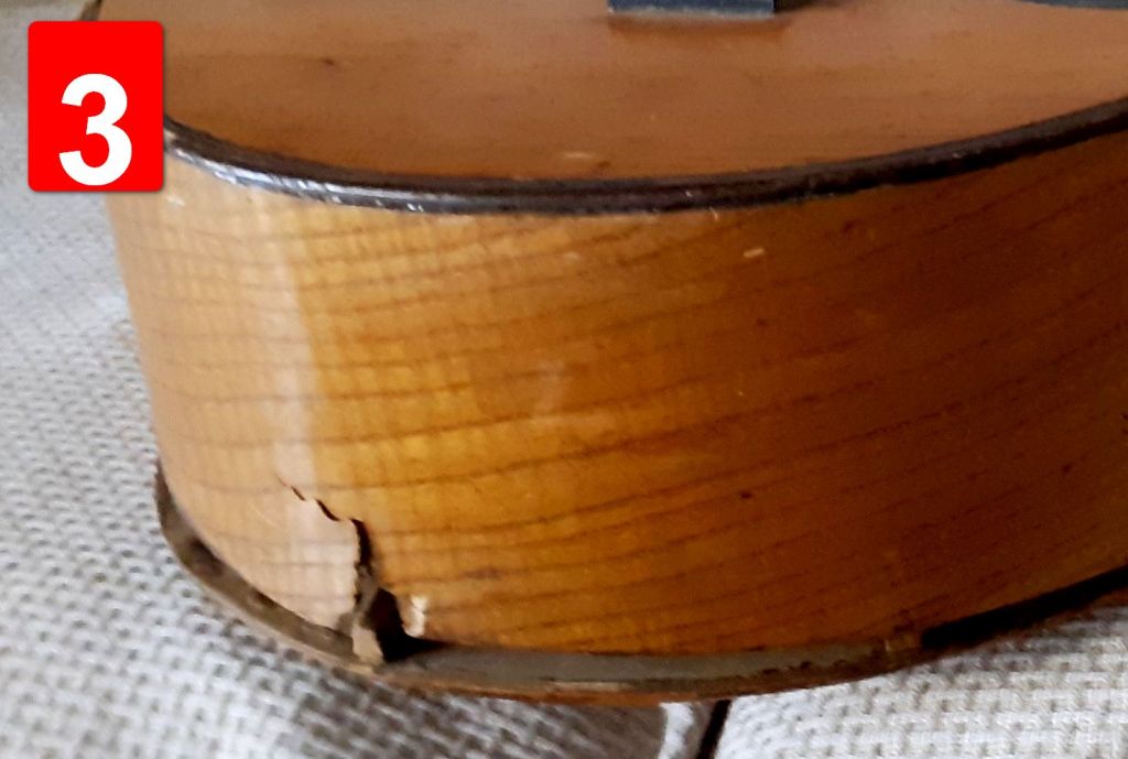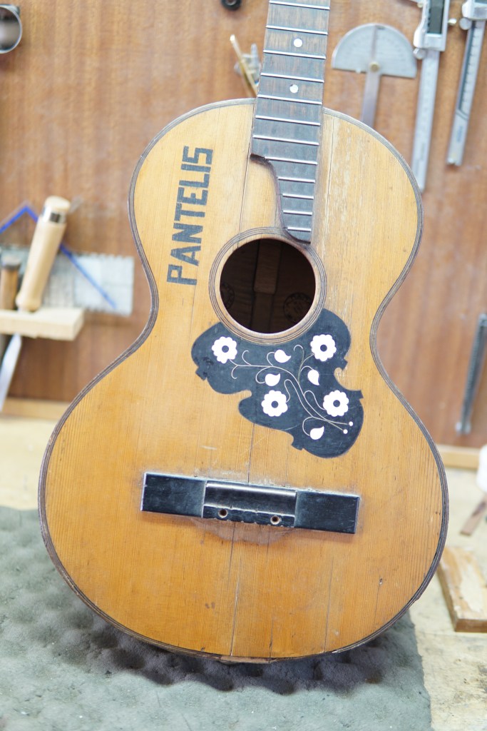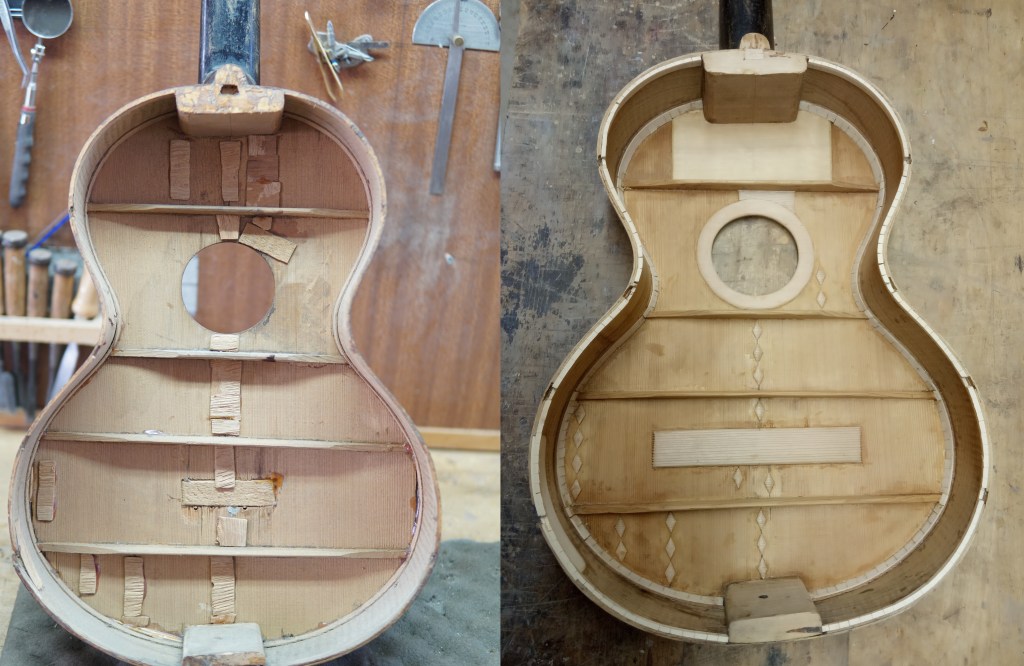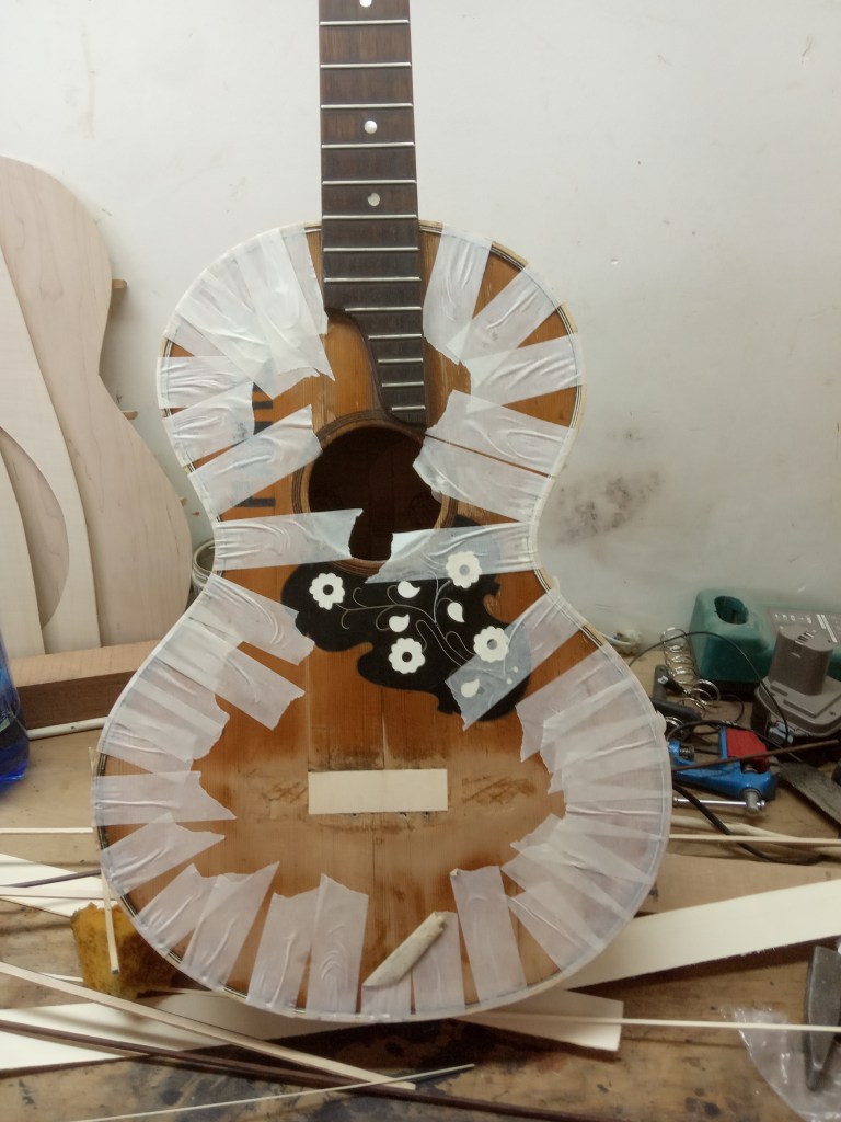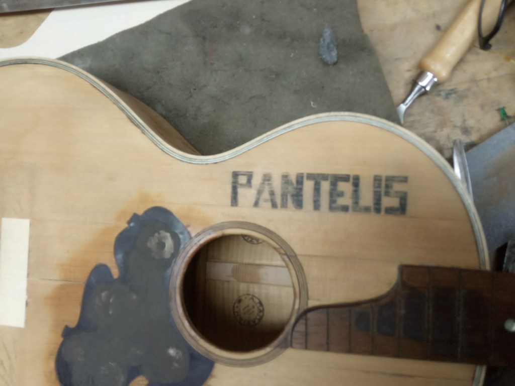 Η πλάτη της κιθάρας διαλύθηκε εντελώς. Βγήκαν τα καμάρια, τα μπαλώματα, οι κόλλες χωρίστηκε σε δυο κομμάτια, καθαρίστηκε το εσωτερικό και η ένωση της. Κολλήθηκαν πάλι τα δυο μέρη, ενισχύθηκε η ένωση με ένα φιλέτο κέδρου και μετά κολλήθηκαν στη θέση τους τα καμάρια.