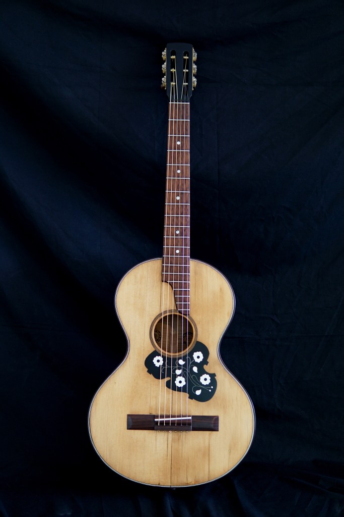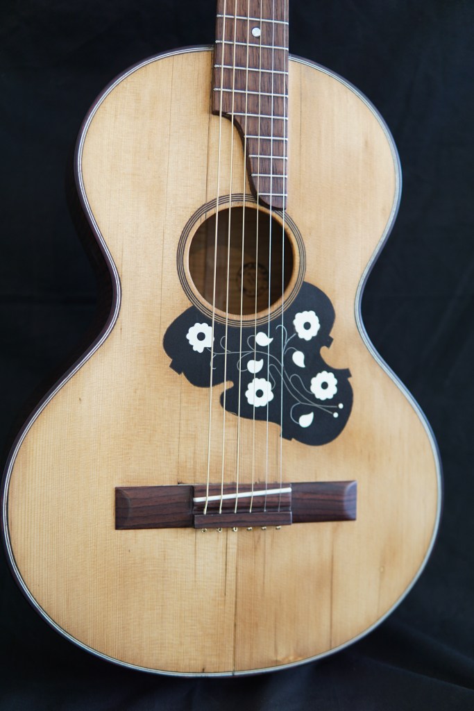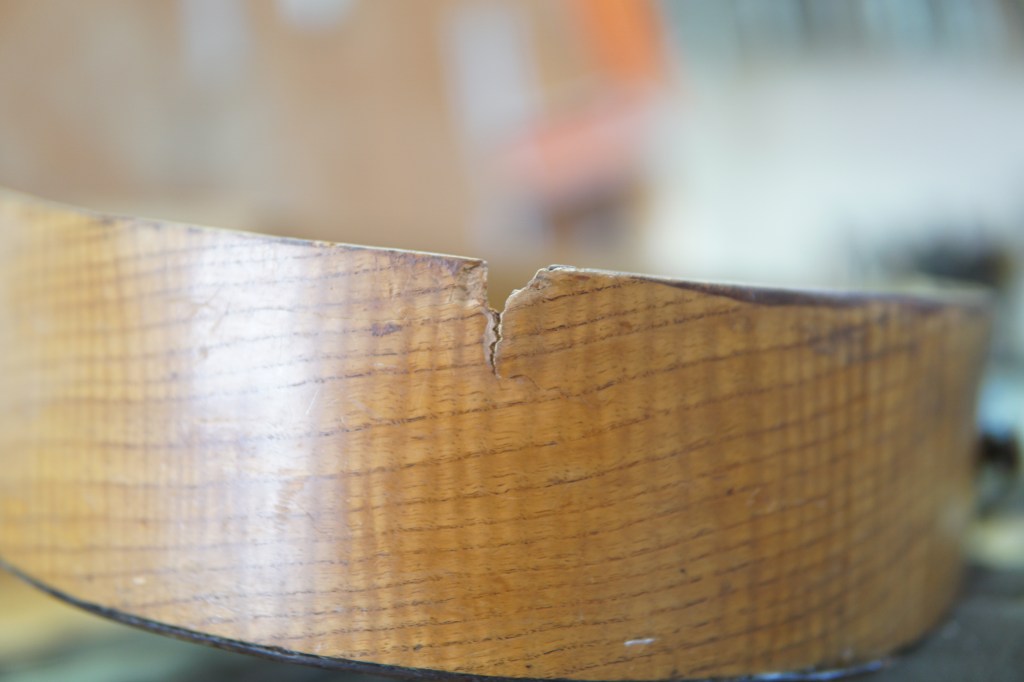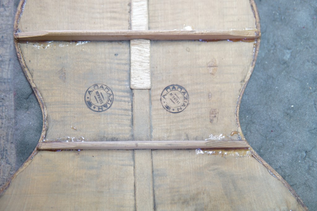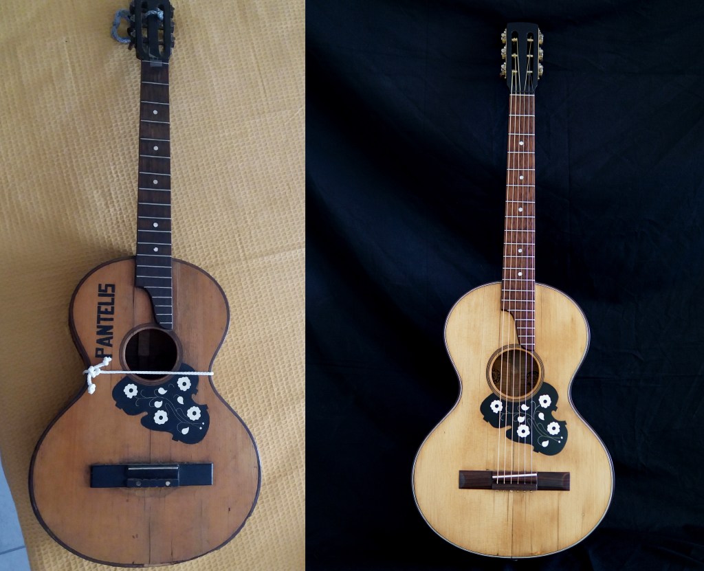 Η πλάτη της κιθάρας διαλύθηκε εντελώς. Βγήκαν τα καμάρια, τα μπαλώματα, οι κόλλες χωρίστηκε σε δυο κομμάτια, καθαρίστηκε το εσωτερικό και η ένωση της. Κολλήθηκαν πάλι τα δυο μέρη, ενισχύθηκε η ένωση με ένα φιλέτο κέδρου και μετά κολλήθηκαν στη θέση τους τα καμάρια.