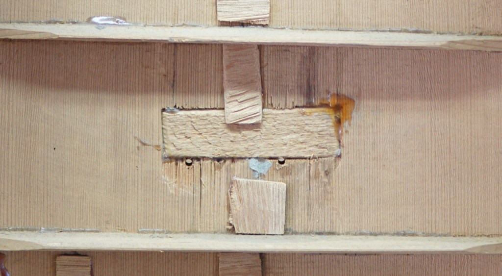 Kάτω από τον καβαλάρη έλειπε ενα μεγάλο κομμάτι από το καπάκι, και είχε αντικατασταθεί με αυτό το κομμάτι ξύλο.