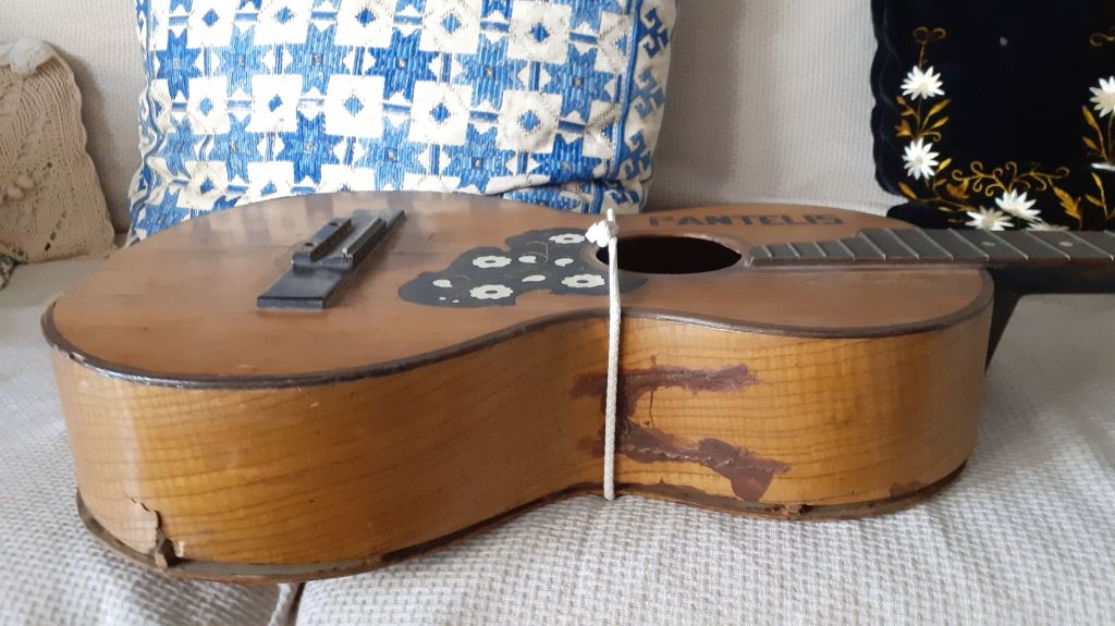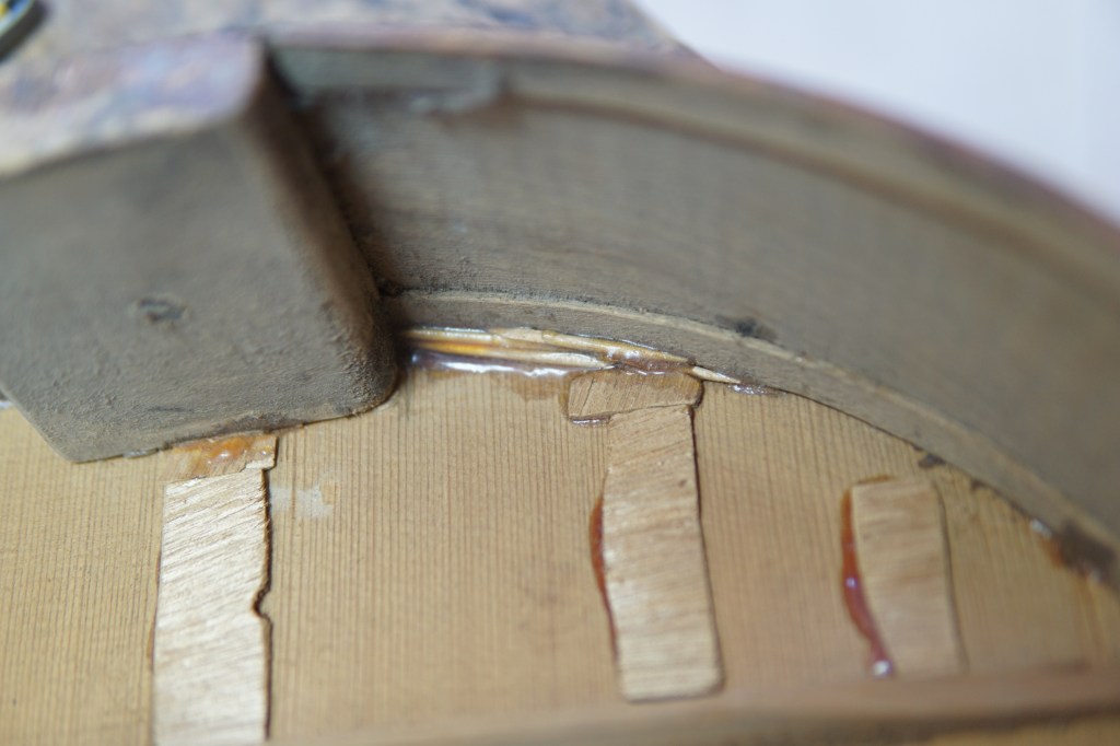Το κάτω πλαϊνό ήταν σπασμένο σε δύο σημεία, επίσης στραβοκολλημένο και πασαλειμμένο με μια άγνωστη για εμένα κόλλα που θα τη συναντήσουμε και αργότερα σε πολλά σημεία στο όργανο..