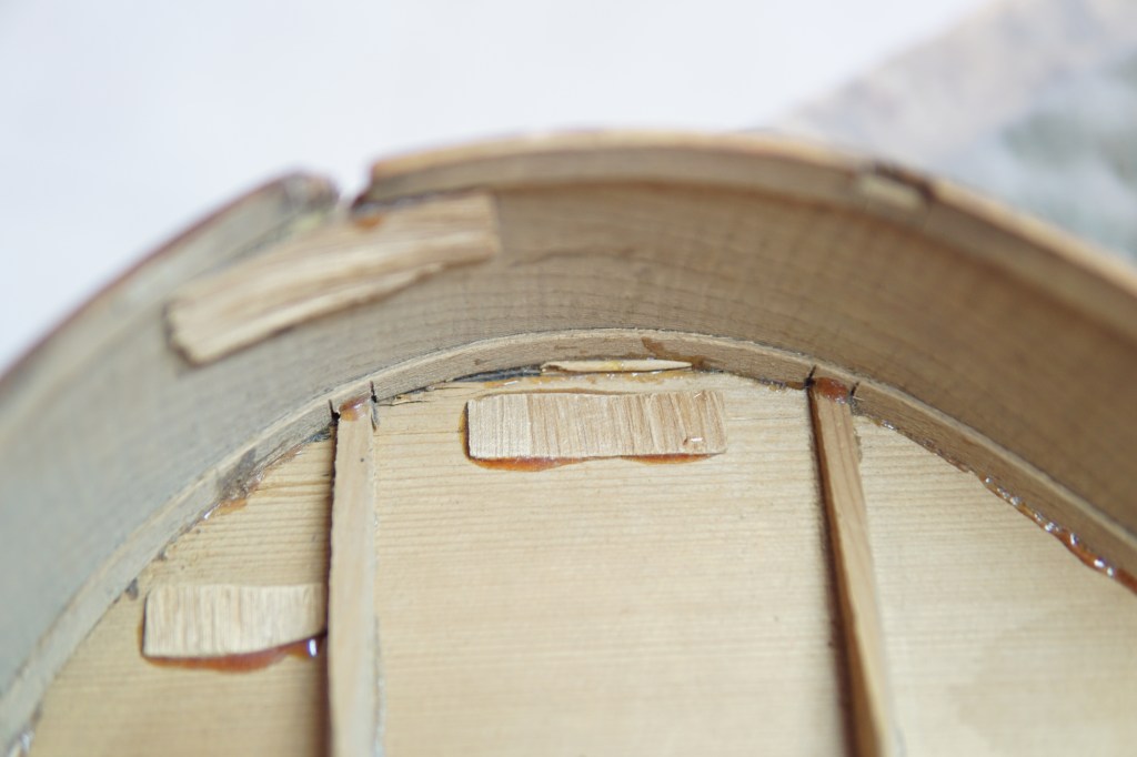 - Ενίσχυση περιμετρικά στο καπάκι. Ολόκληρο το καπάκι αφού καθαρίστηκε καλά από προηγούμενες κόλλες και προσθήκες, κολλήθηκε εκ νέου στα σημεία που ήταν ξεκολλημένο και ενισχύθηκε ολόκληρο περιμετρικά με ένα ενωτικό φιλέτο από φλαμούρι. Το φιλέτο αυτό δίνει στο όργανο την απαραίτητη επιφάνια κόλλησης μεταξύ καπακιού και πλαινών για το γερό κράτημα τους, και θα μας επιτρέψει αργότερα που θα κάνουμε ξανά την πατούρα για να αντικαταστήσουμε τα διαλυμένα διακοσμητικά φιλέτα, να μπούμε με ασφάλεια πιο μέσα και να καθαρίσει το παλιό και σαθρό ξύλο που είχε πριν.