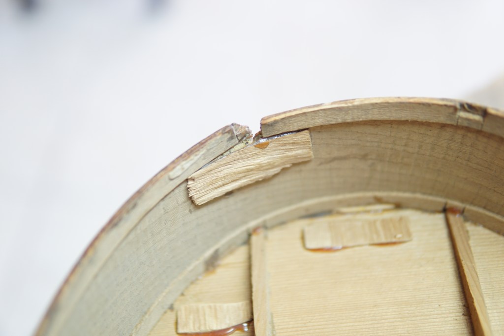 - Ενίσχυση πλαϊνού, το οποίο είχε ενα μεγάλο στραβοκολλημένο σπάσιμο, πασαλειμμένο με κόλλα (Φωτ.2). Σε αυτό το σημείο χρειάστηκε να φτιαχτεί ενα καλούπι που να έχει το σχήμα της καμπύλης του πλαϊνού ώστε να μπορέσει να σφιχτεί καλά και να κρατήσει το σχήμα του αναλλοίωτο. Πριν από όλα αυτά αποκολλήθηκαν, καθαρίστηκαν και επανασυστάθηκαν τα σπασμένα μέρη του πλαϊνού.